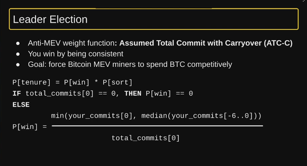 The Nakamoto system uses a variation of the Assumed Total Commitment with Carryforward (ATC-C) [MEV](https://github.com/stacksgov/sips/blob/main/sips/sip-021/MEV-Report.pdf) mitigation strategy to allocate block rewards to miners. The probability a miner will win the block and be granted the current tenure will be based on a function that accounts for the total block commit spend on the blocks leading up to the current block.