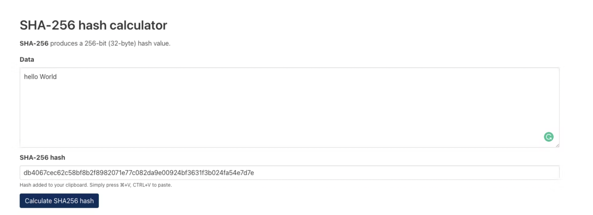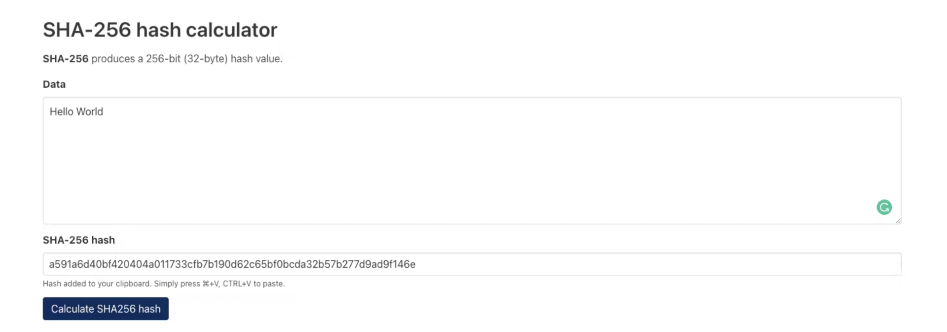 If we type "Hello World" into the input box, we get a hash back.